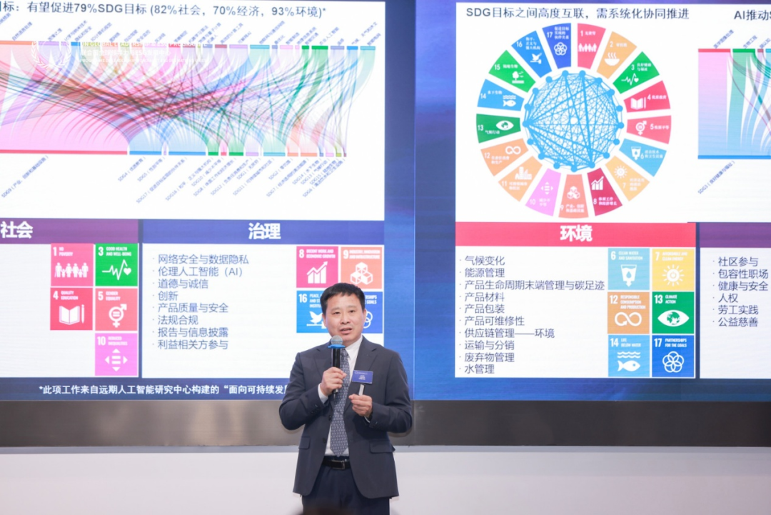 除了人才战略,联想集团副总裁、全球电脑与智能设备首席质量官王会文还展示了如何以AI技术为引擎,推动ESG从理念走向实践,实现“从智能到智善”的跨越。王会文认为,人工智能发展的根本目的是造福人类,AI不仅是提升效率的工具,更是放大系统治理能力的关键。通过连接分散的业务与供应链数据,AI能够显著加速SDG目标的协同推进。